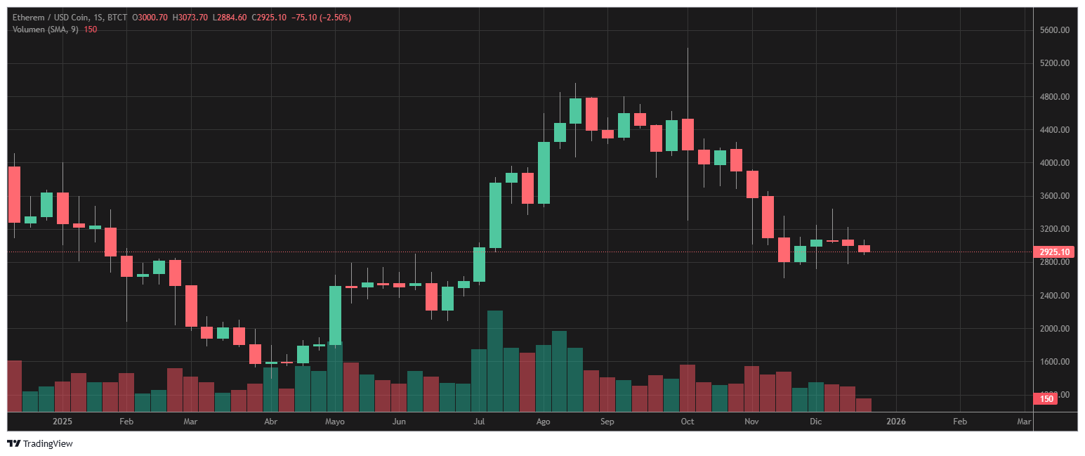 En Ethereum, se perciben indicadores similares a los comentados anteriormente para Bitcoin. Hablamos de grandes salidas de capital institucional de los ETF (USD 564 millones en salidas netas en diciembre) y rupturas de soportes técnicos que marcan una posible tendencia bajista.